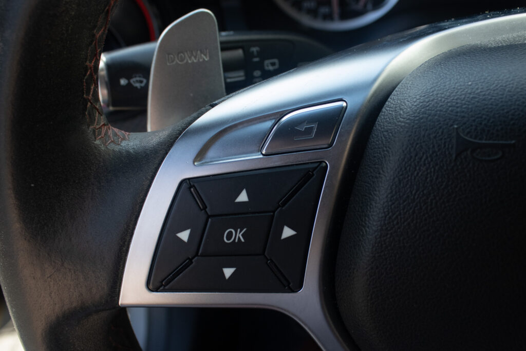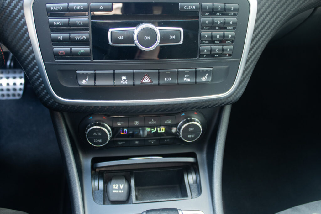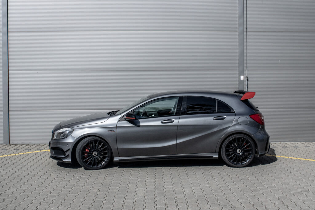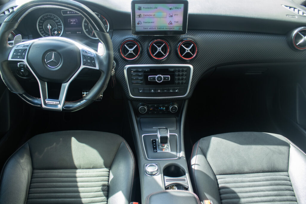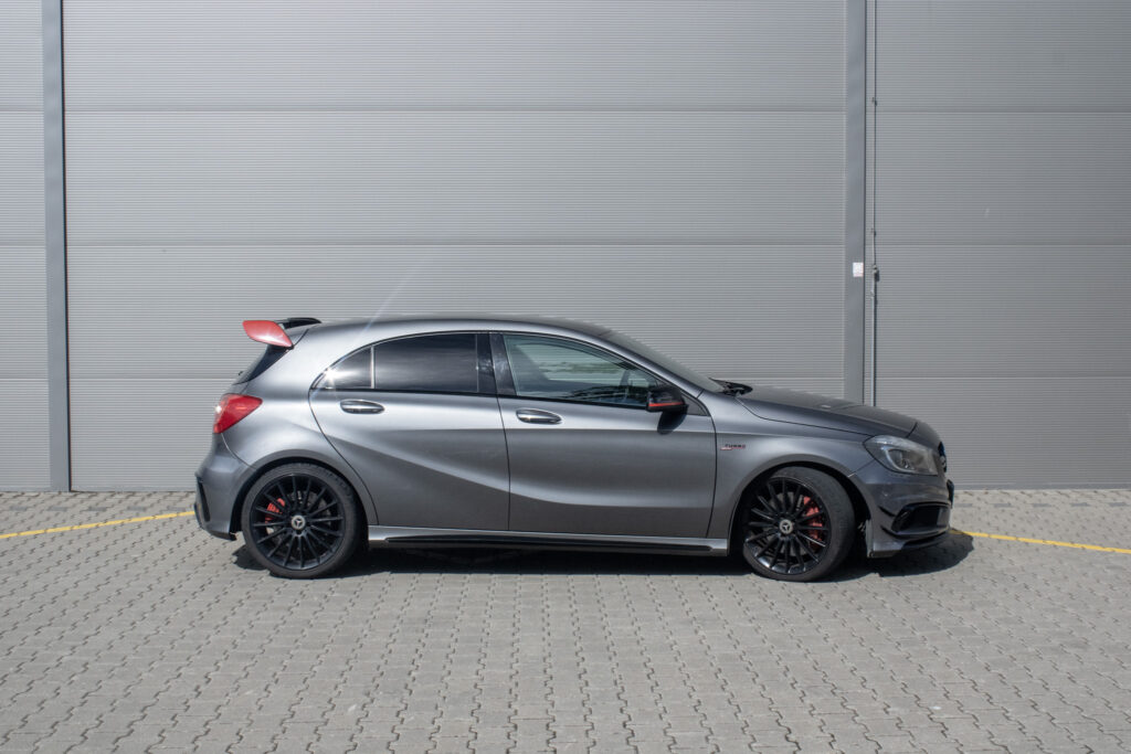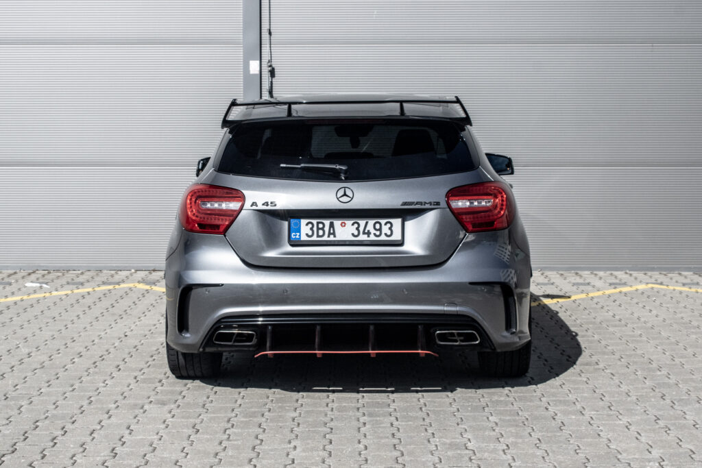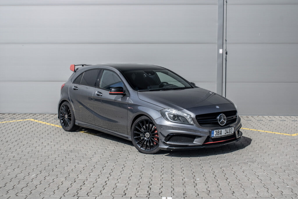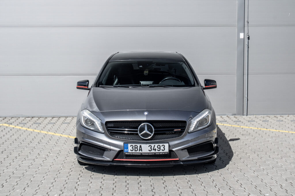 Mercedes-Benz A45 AMG je sportovní hatchback s pohonem všech kol 4x4 a automatickou převodovkou. Pod kapotou pracuje přeplňovaný benzínový motor o objemu 1991 cm³ s výkonem 265 kW, díky němuž patří k nejvýkonnějším vozům své třídy. Vůz byl poprvé registrován 2013. Šedá metalická karoserie podtrhuje jeho sportovní charakter, zatímco interiér s prvky Alcantary dodává na exkluzivitě. Kompaktní rozměry v kombinaci s pětidveřovým provedením a pěti místy k sezení z něj dělají praktický výkonný automobil pro každodenní použití.